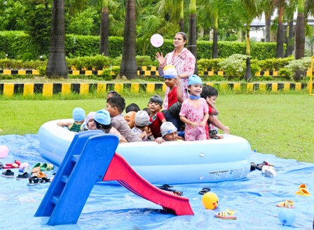 After the much-awaited summer break, the Pre-Primary section of DPS Asansol reopened with joyful cheer and vibrant energy on a delightful note. To mark the welcome of our little learners back to school, a fun-filled event “Summer Splash” was organized on the school grounds, creating a refreshing and exciting start to the academic routine. The event was a colorful celebration of laughter, water play, and cheerful reunions. Children came dressed in their swimwear, excited to splash around with their friends. Two splash pools, a bright slide, beach balls, and a play zone were set up to create a mini water park experience for the tiny tots. The entire area was beautifully decorated with summer-themed cut-outs and a lively backdrop that read “DPS Asansol Summer Splash.” Teachers and support staff ensured the children’s safety while they enjoyed to their heart’s content. The little ones dipped into the pools, played with floating toys, and danced under colorful umbrellas, making memories that will stay with them for a long time. Even the drizzle could not dampen their spirits—it only added to the fun! The event was a beautiful example of how learning environments can be joyful and emotionally enriching. The smiles, giggles, and cheerful splashes echoed the spirit of DPS Asansol – where every child is nurtured with care, happiness, and love. It was truly a splash-tastic welcome for our young learners!